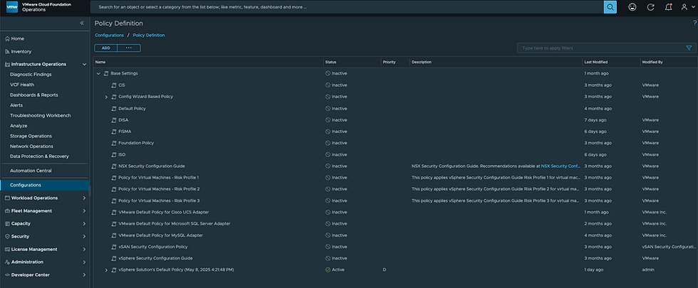 I'm running VCF Operations 9 (which I've upgraded from 8.18.4, all screenshots here are from VCF Operations 9. Go to Infrastructure Operations - Configurations - Policies and you'll find the Policy Definition tile.