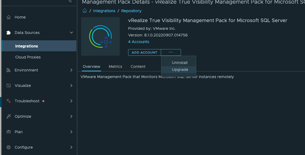 Let's upgrade the MSSQL Management Packs to 9.0 and remove the old vRTVS license and see what happens. The upgrade looks like this.